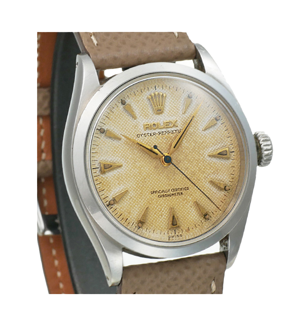 VINTAGE PARIS > Watches ロレックス セミバブルバック 価格はお問い合わせください。 Contact Customer Service 問い合わせ 時計製造における最も重要な出来事のいくつかは、ロレックスに起因します。1926年、ロレックスは初の防水腕時計であるオイスターを発表。このケースは、湿気や埃がムーブメントにダメージを与えないよう、ねじ込み式リューズを備えていました。5年後の1931年、ロレックスはパーペチュアルシリーズに初の自動巻きローターを導入し、安定した巻き上げを実現しました。1945年、デイトジャストは自動日付変更機能を備えた初のクロノメーター腕時計となりました。 Great Condition リファレンス : 6284 ムーブメント : オートマティック サイズ : 34 mm 素材 : ステンレススチール 同じようなアイテムをお持ちですか?是非当店にお売りください!